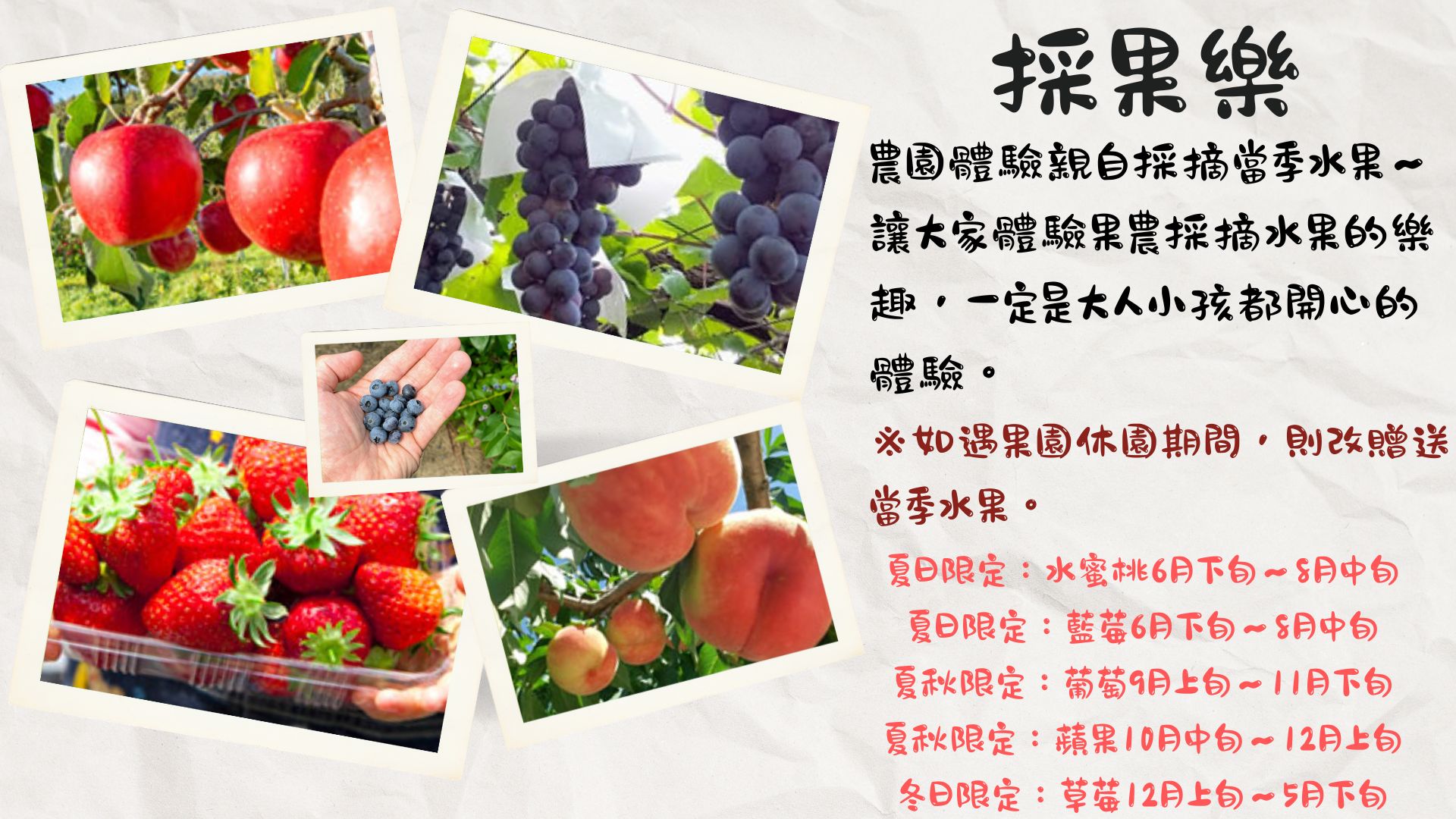註3:全球氣候變化莫測,每年收穫期長短難預測,實際採果種類請依各家果園收穫量為主,採摘規定不盡相同,將依前往果園的規定為準,敬請知悉。